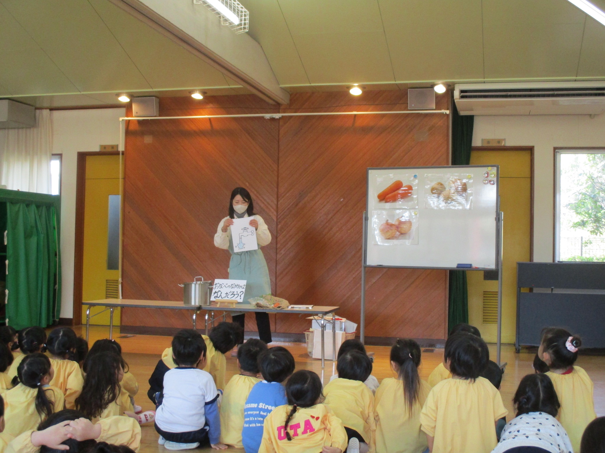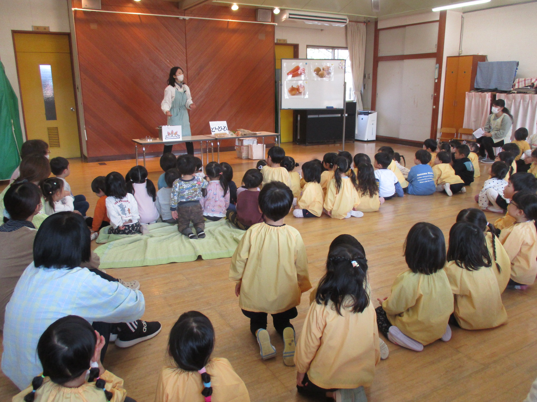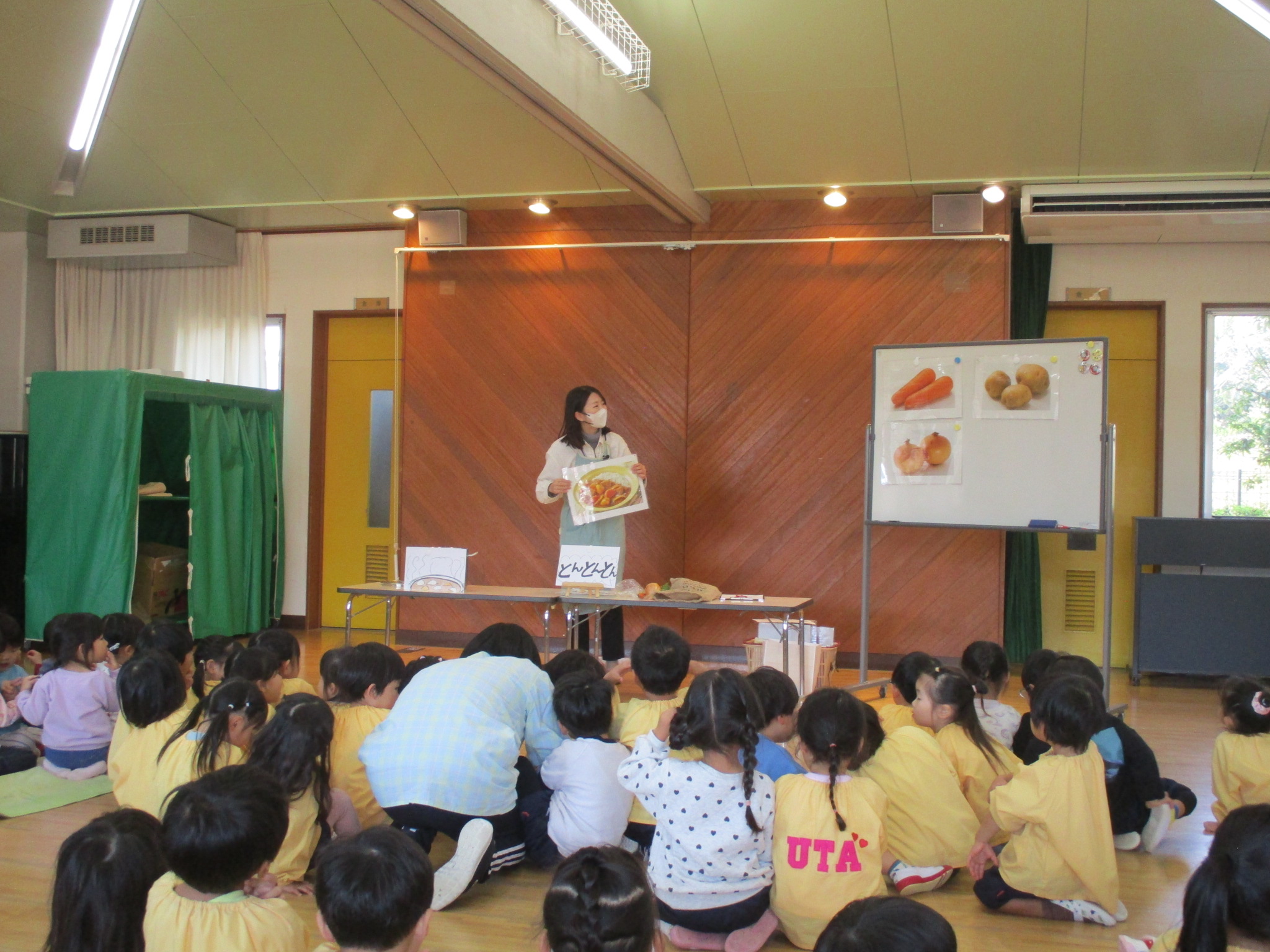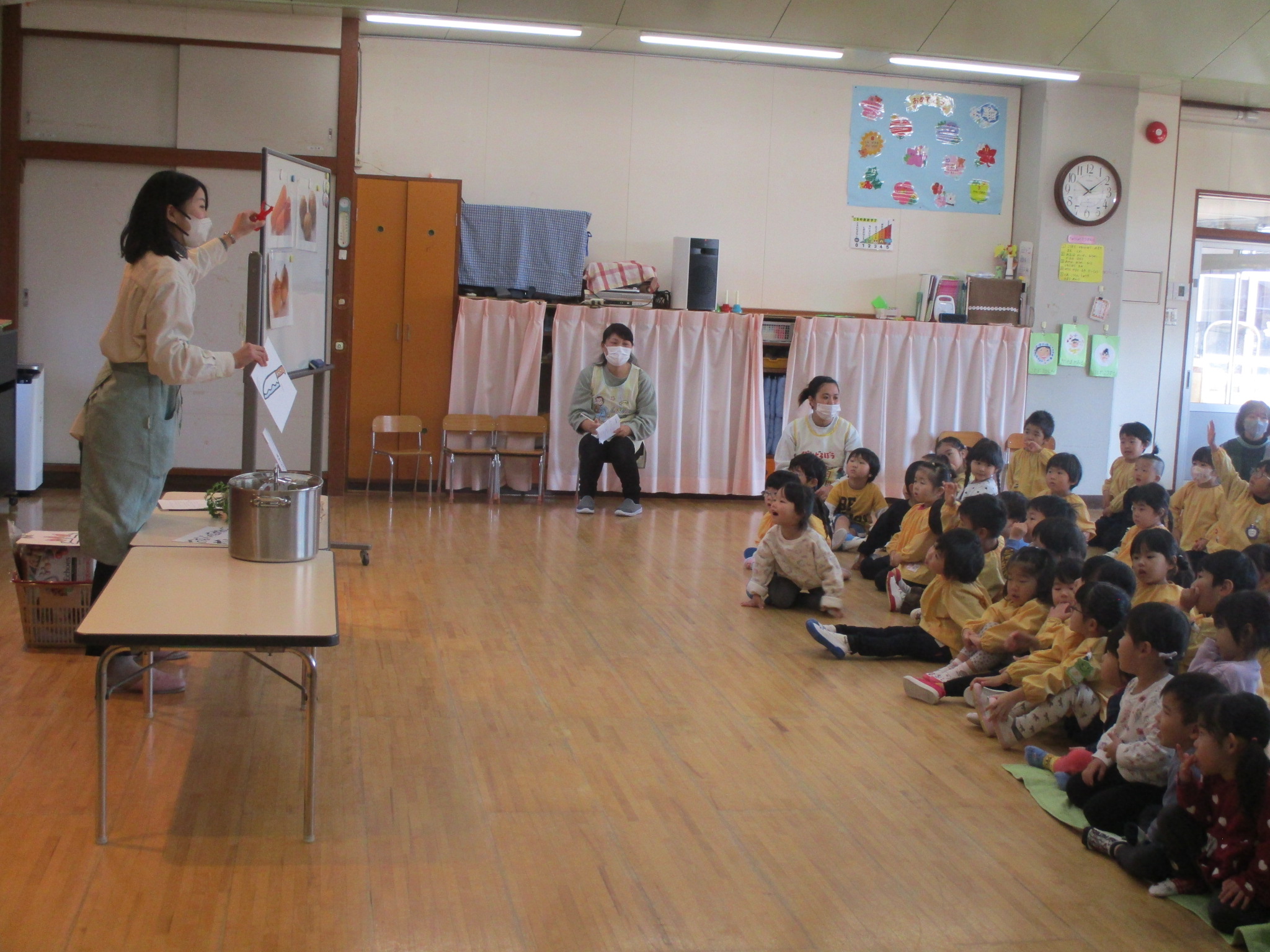 ・11月27日木曜日、3歳児から5歳児まで参加しての『食育講演会』がありました。丹波篠山市健康課の方に来ていただきお話を聞きました。