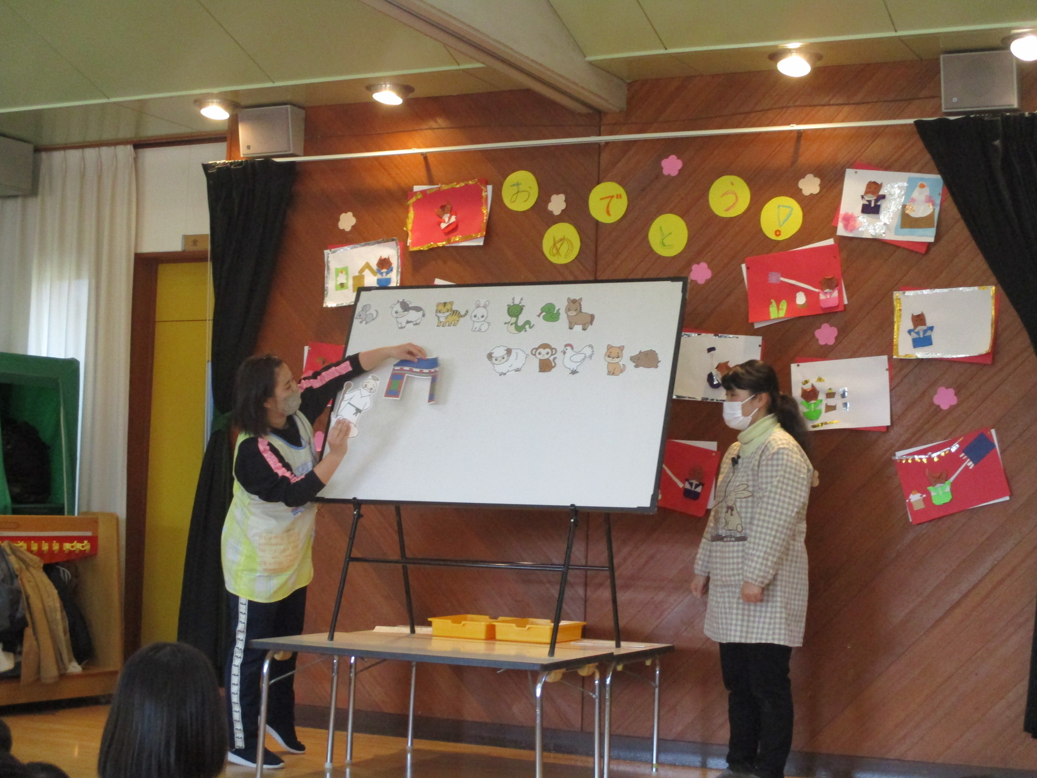 ・今日は、【3学期始まりの会】がありました。保育者のお話、園長先生のお話の後で、『12支のおはなし』のパネルシアターを見ました。
