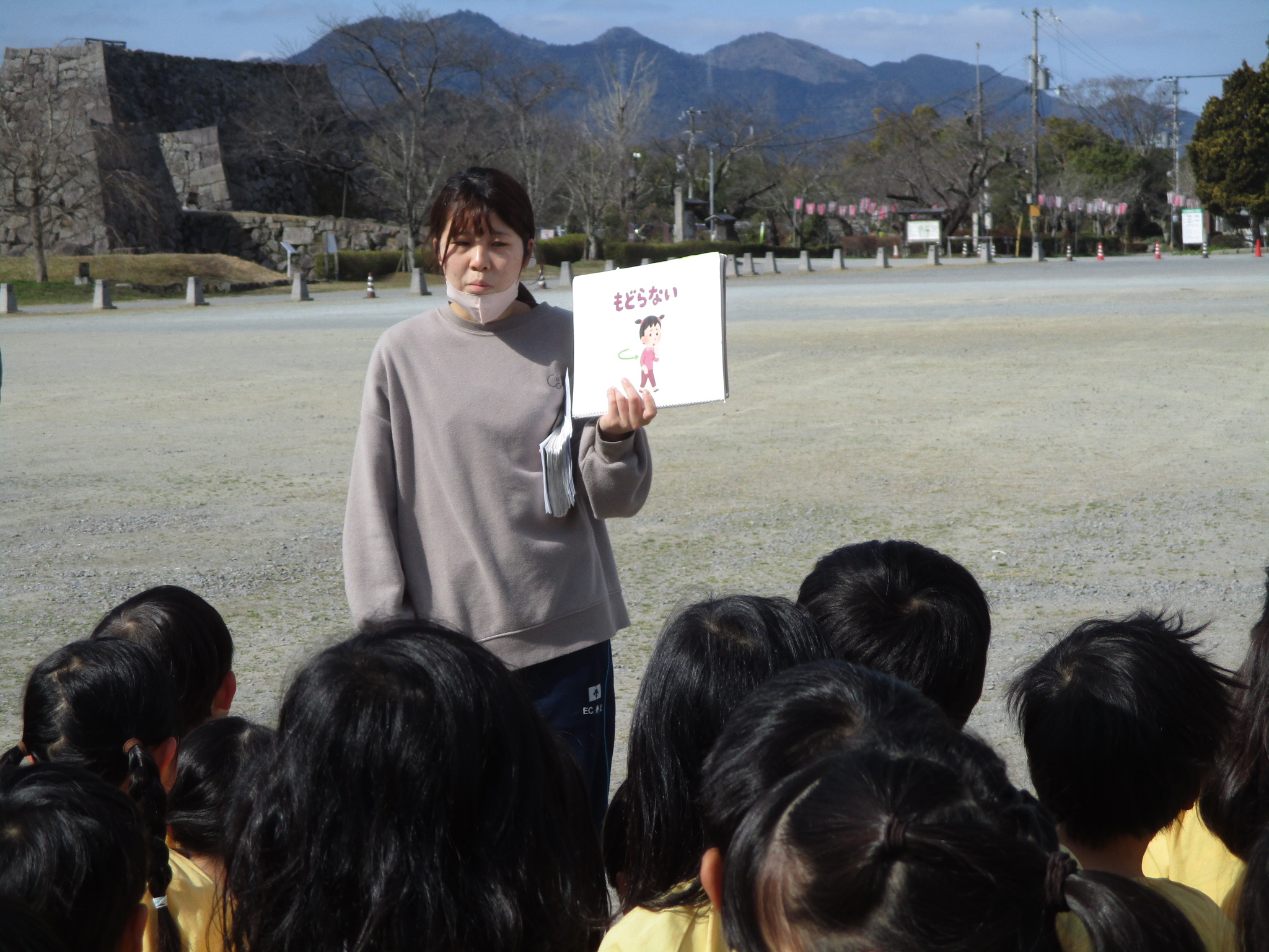 ・子ども達は、保育者の声掛けにより、三の丸広場まで非難し、担当の保育者からのお話を聞きました。