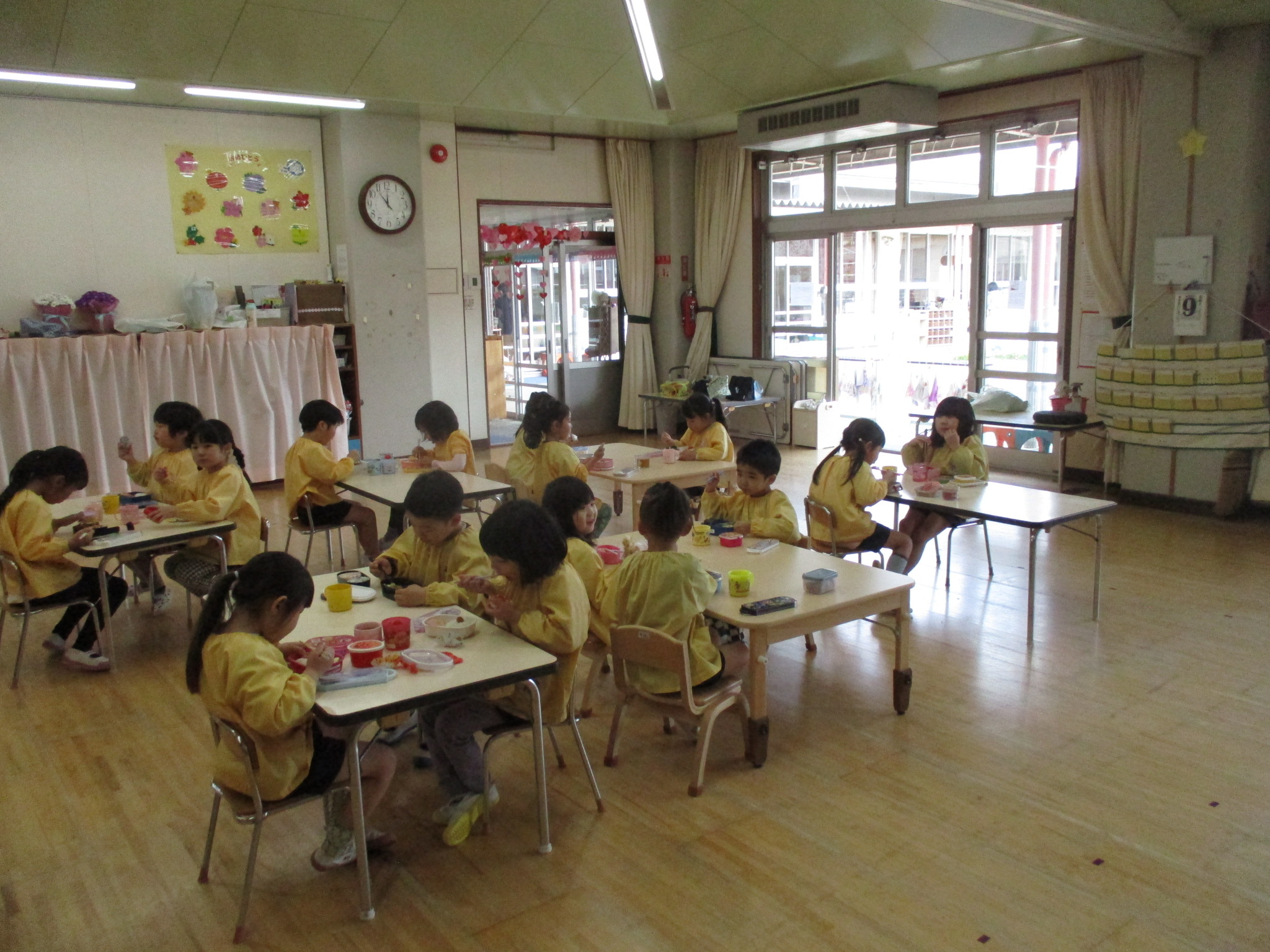 ・子ども達はお弁当が嬉しくて気になってしかたない様子。お弁当の時間になると、「私はキティちゃんのおにぎり」「いちごとバナナ入ってる」などと言いながら喜んで食べていましたよ。
